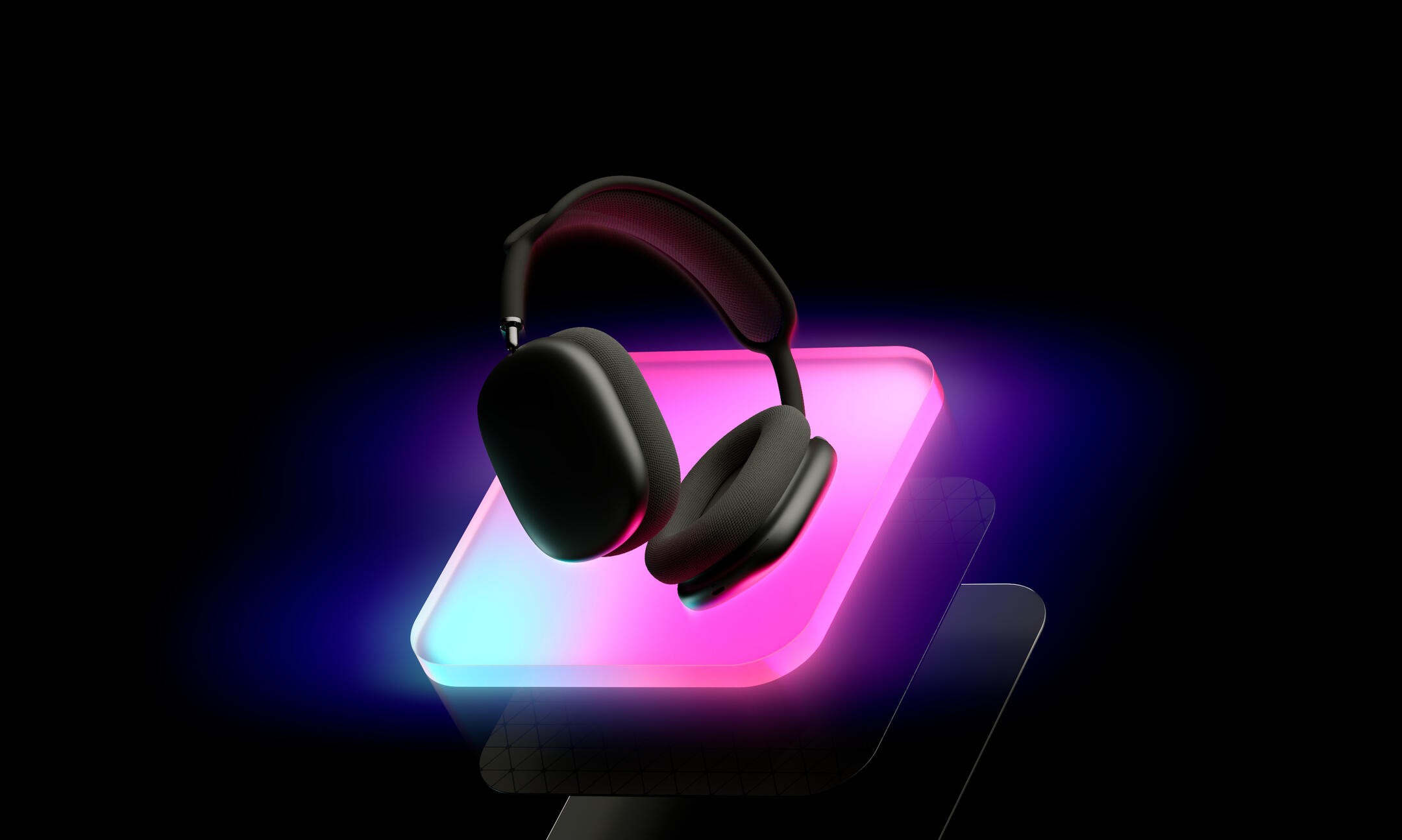 This artwork depicts an AirPods Studio headphone floating above a softly glowing icon, suggesting an audio-focused interface. The composition emphasizes clarity and balance, using light and depth to convey presence, sound, and digital interaction.